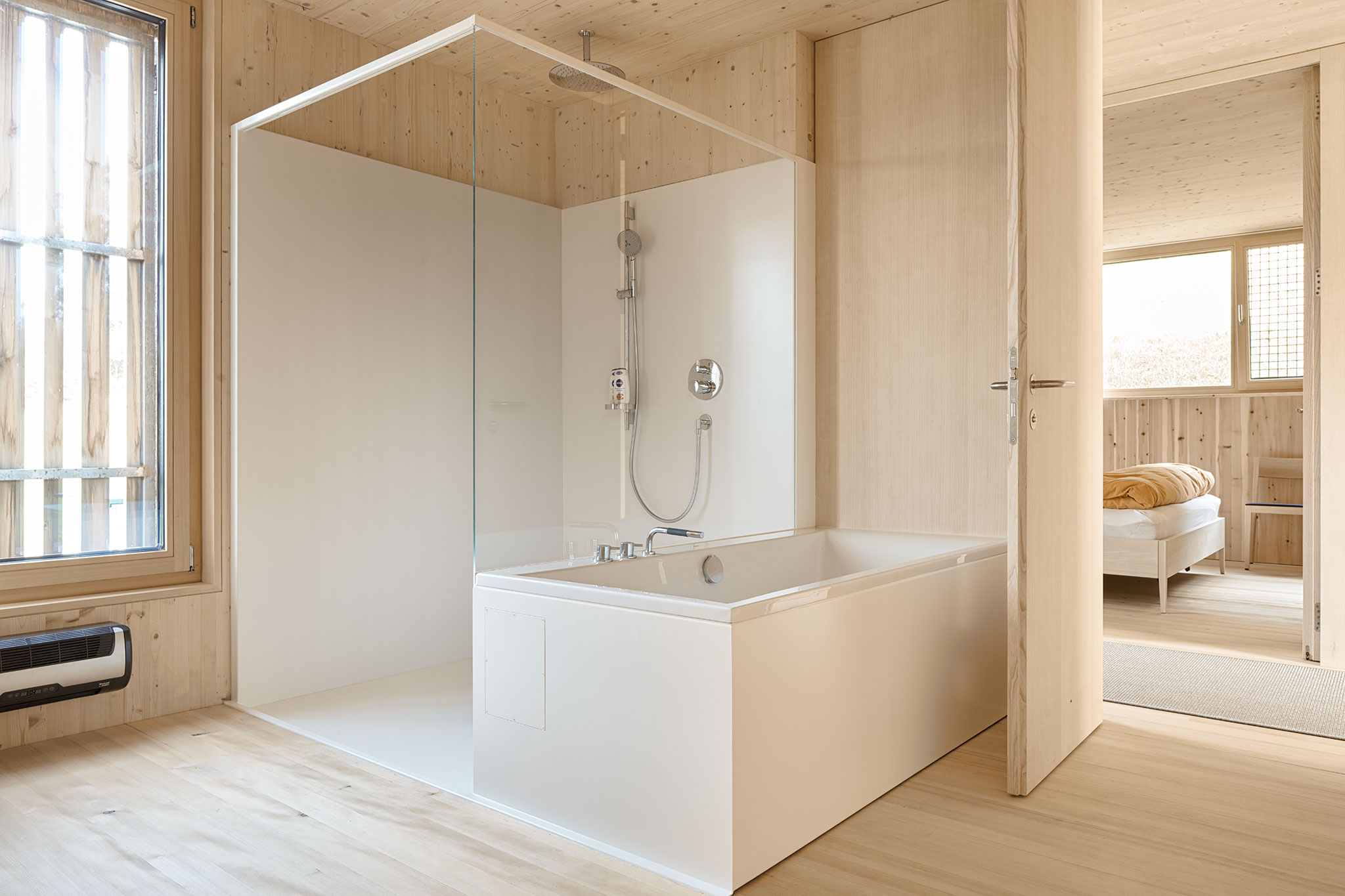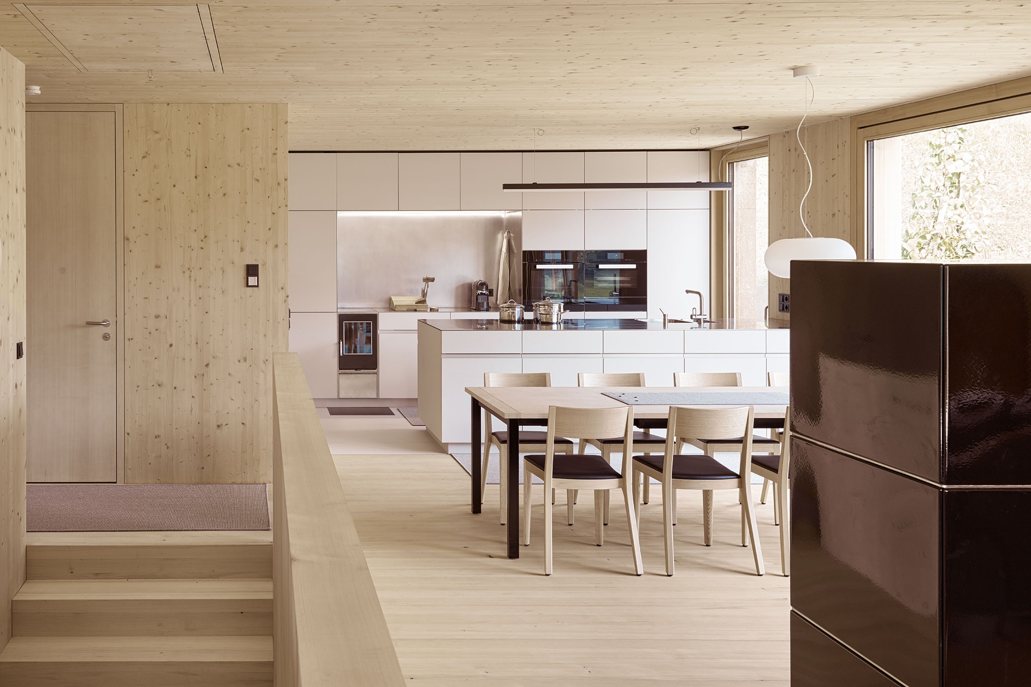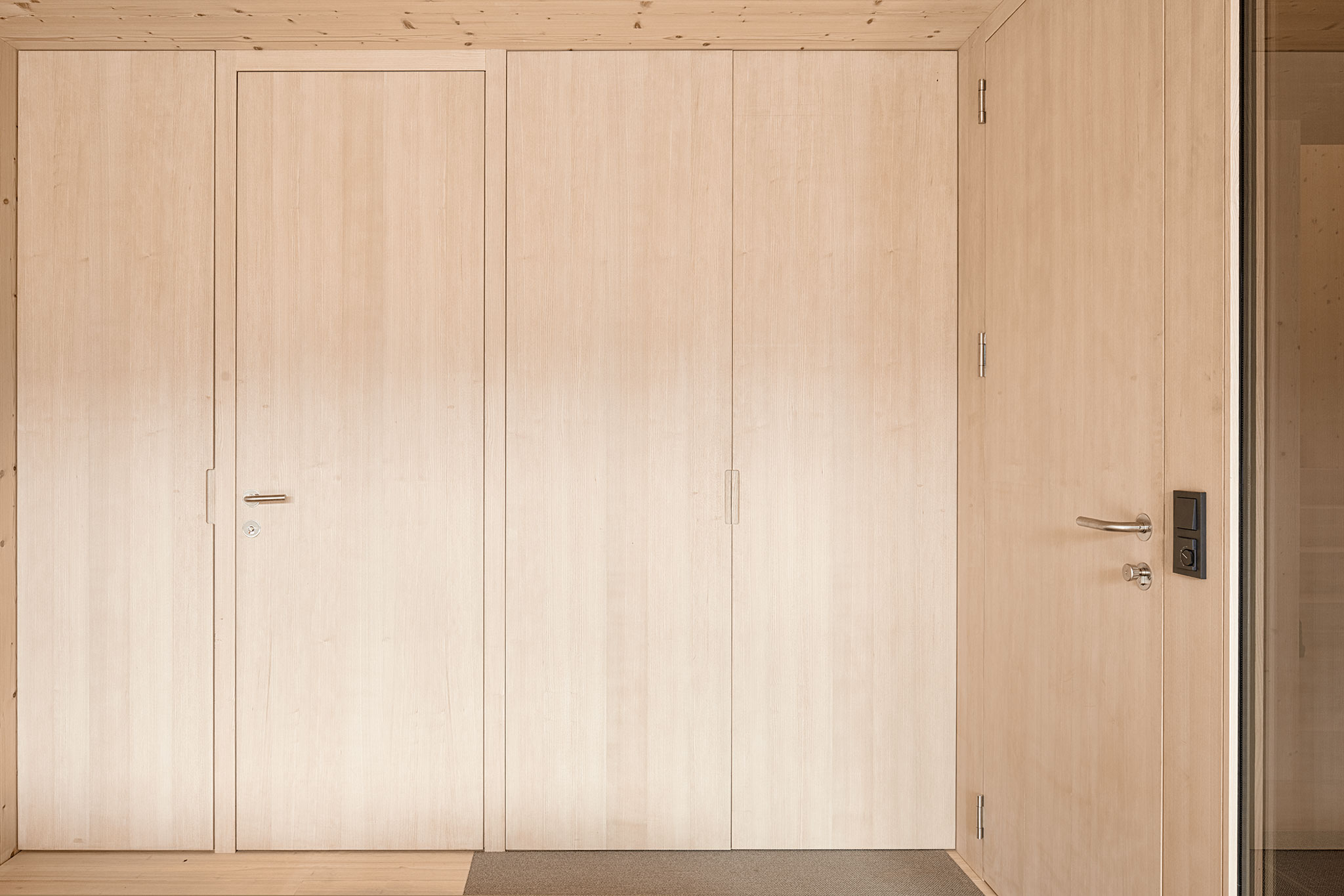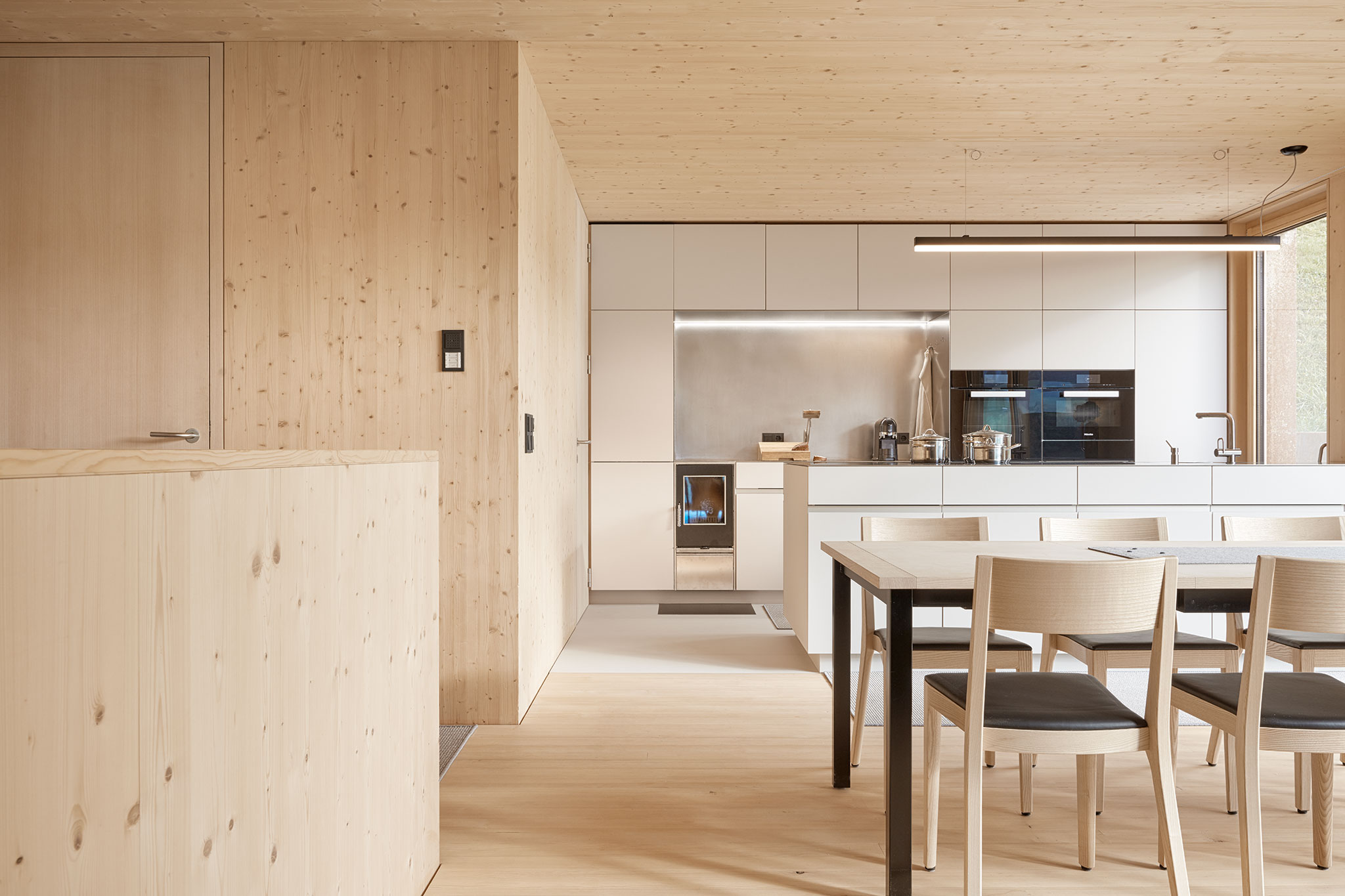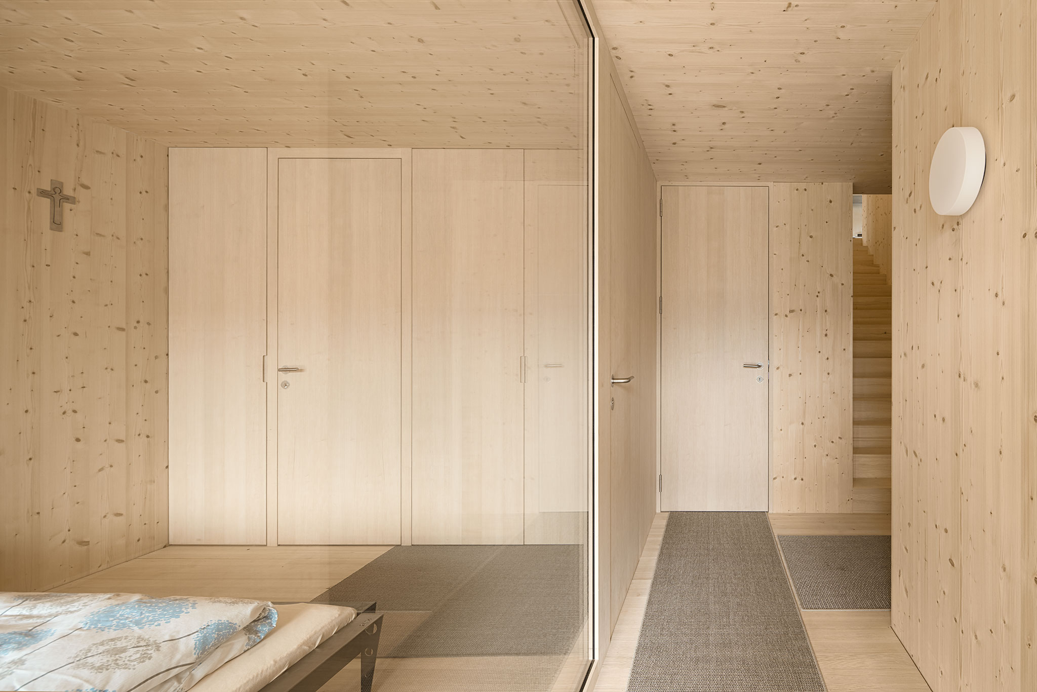 durchgängig in Holz gehalten. Wände und Decken sind aus Fichtenholz, die Riemenböden aus Weisstanne und Türen wie
