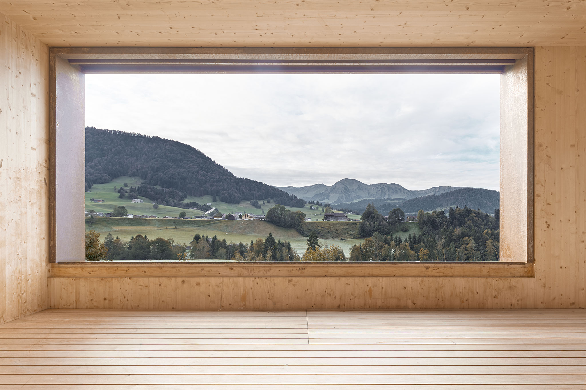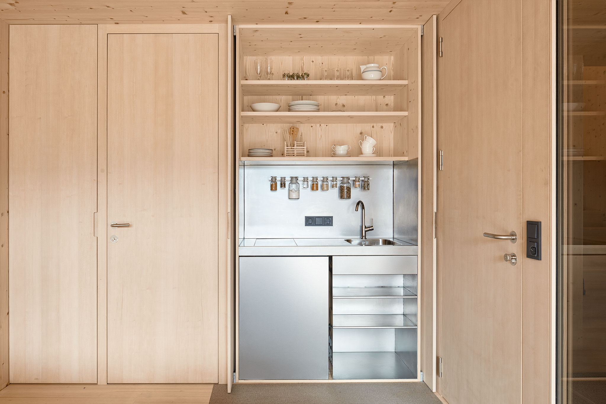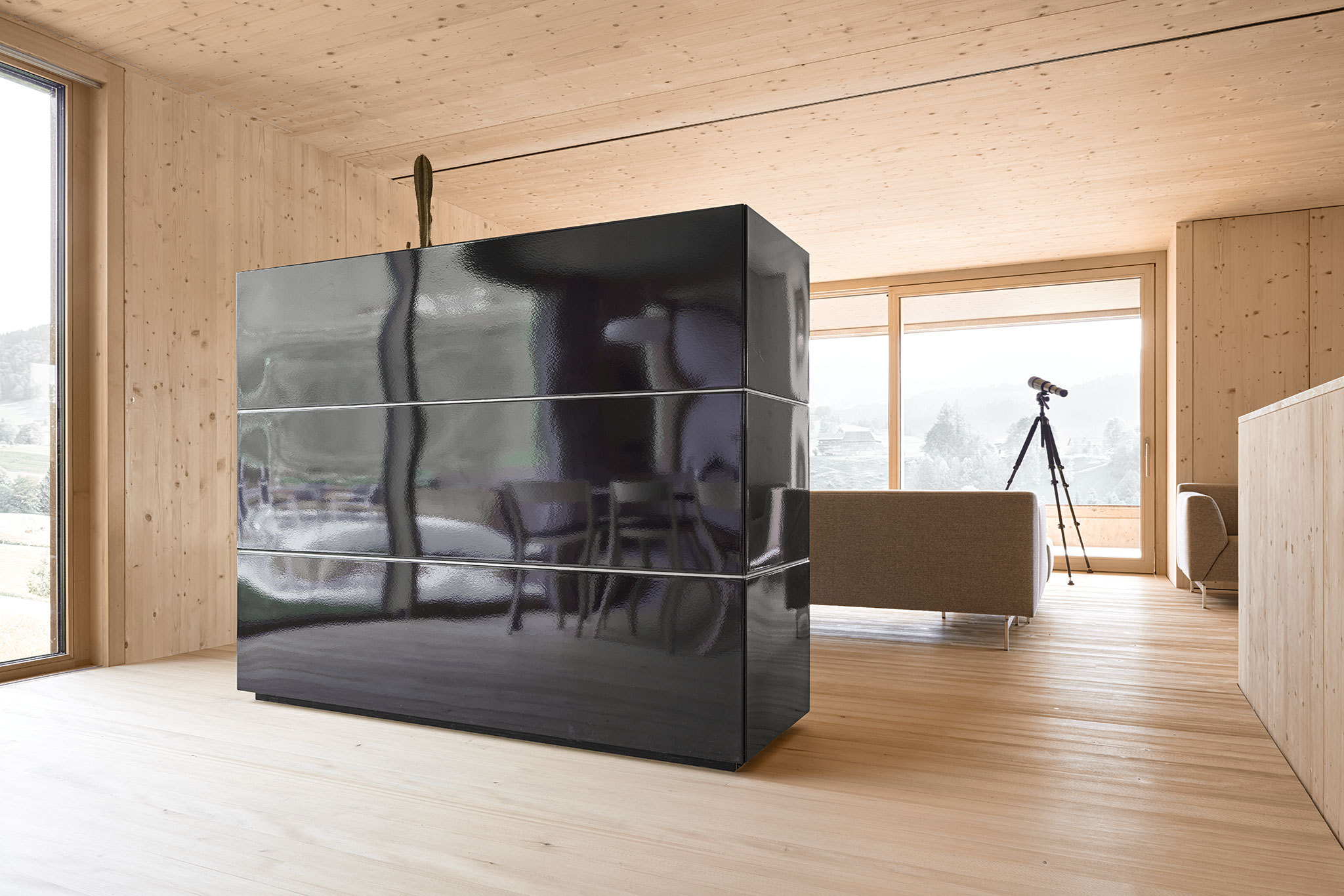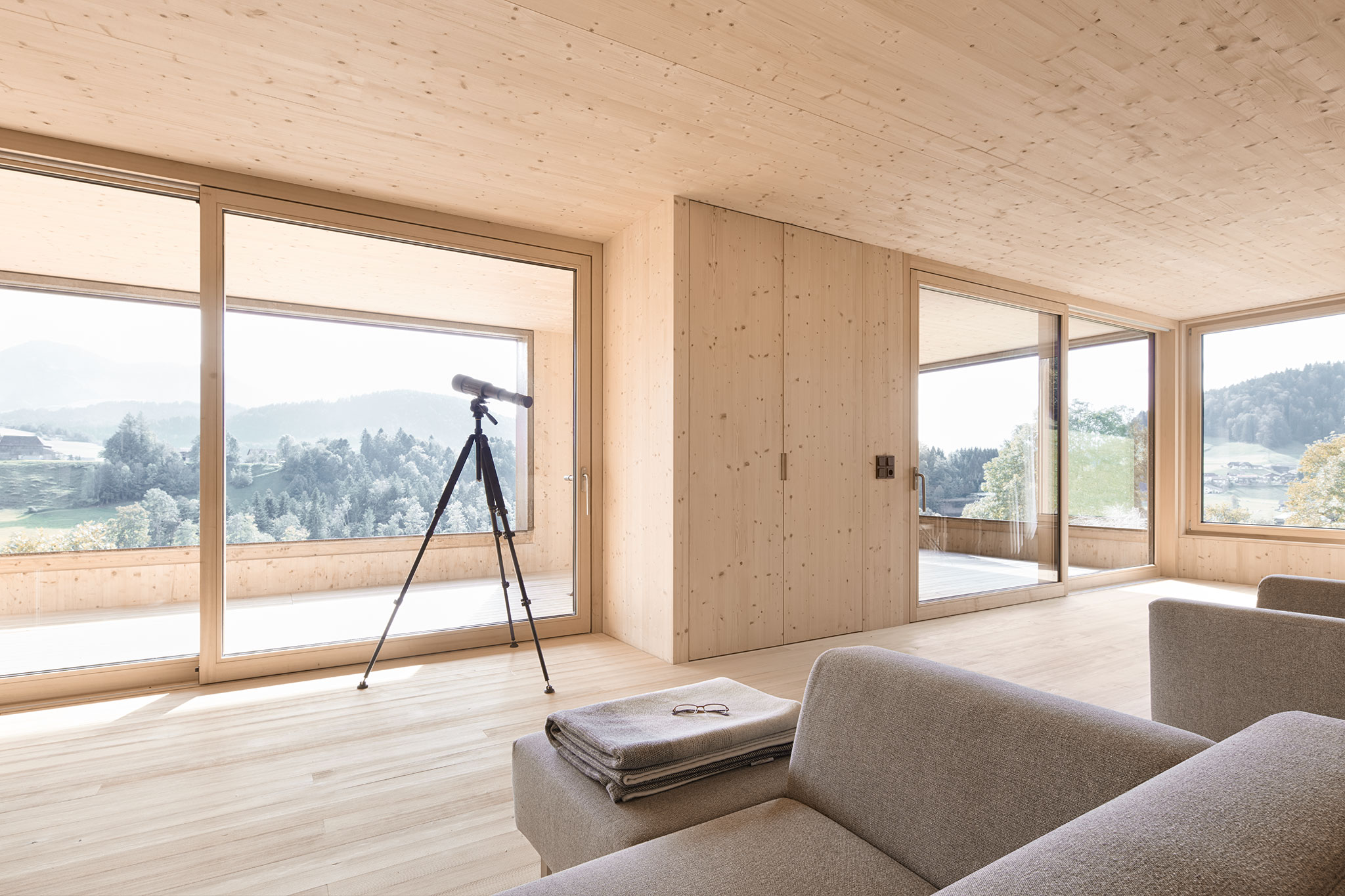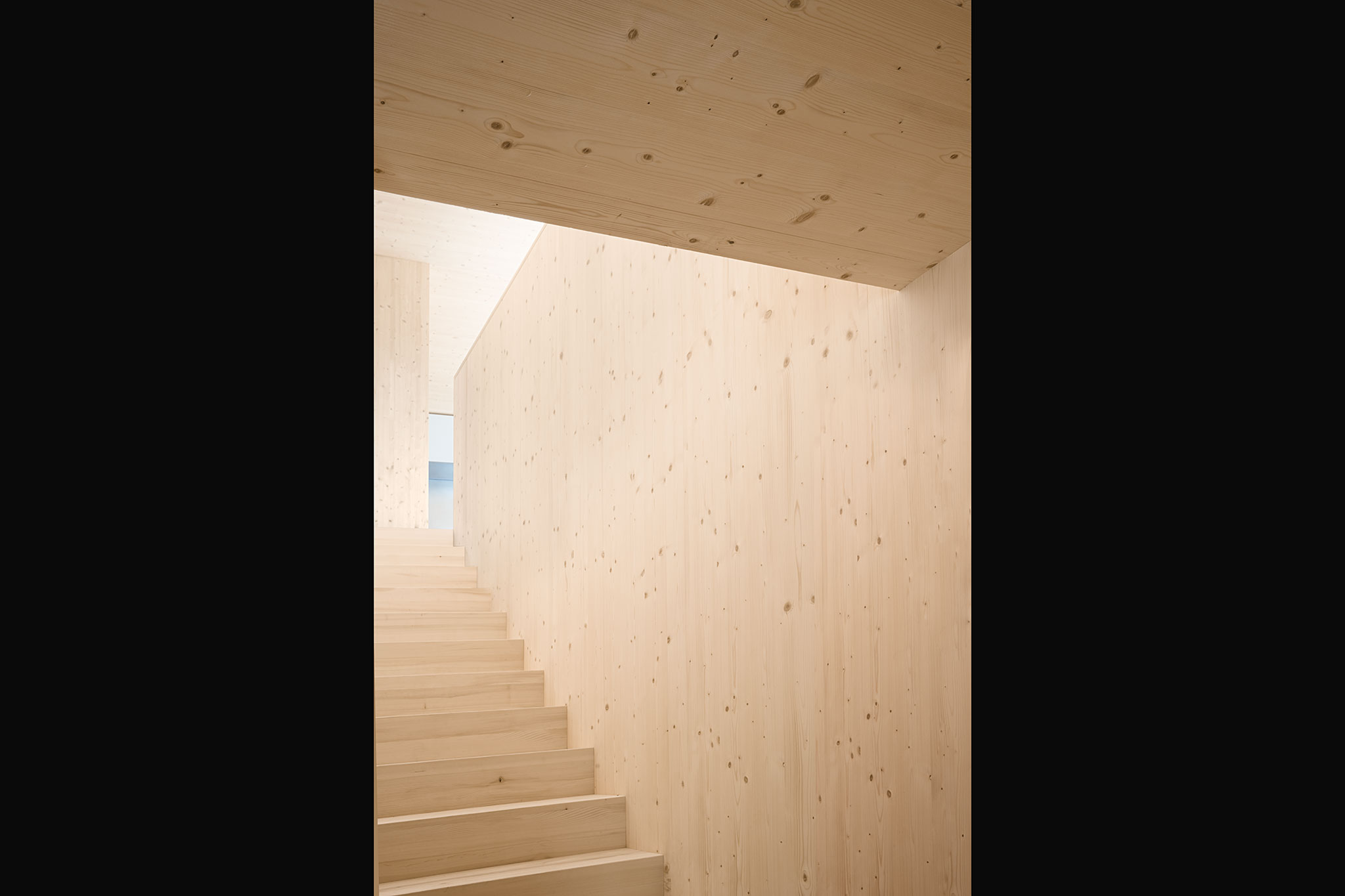 durchgängig in Holz gehalten. Wände und Decken sind aus Fichtenholz, die Riemenböden aus Weisstanne und Türen wie