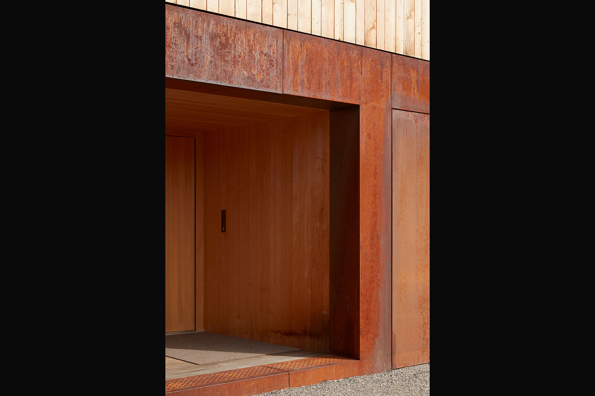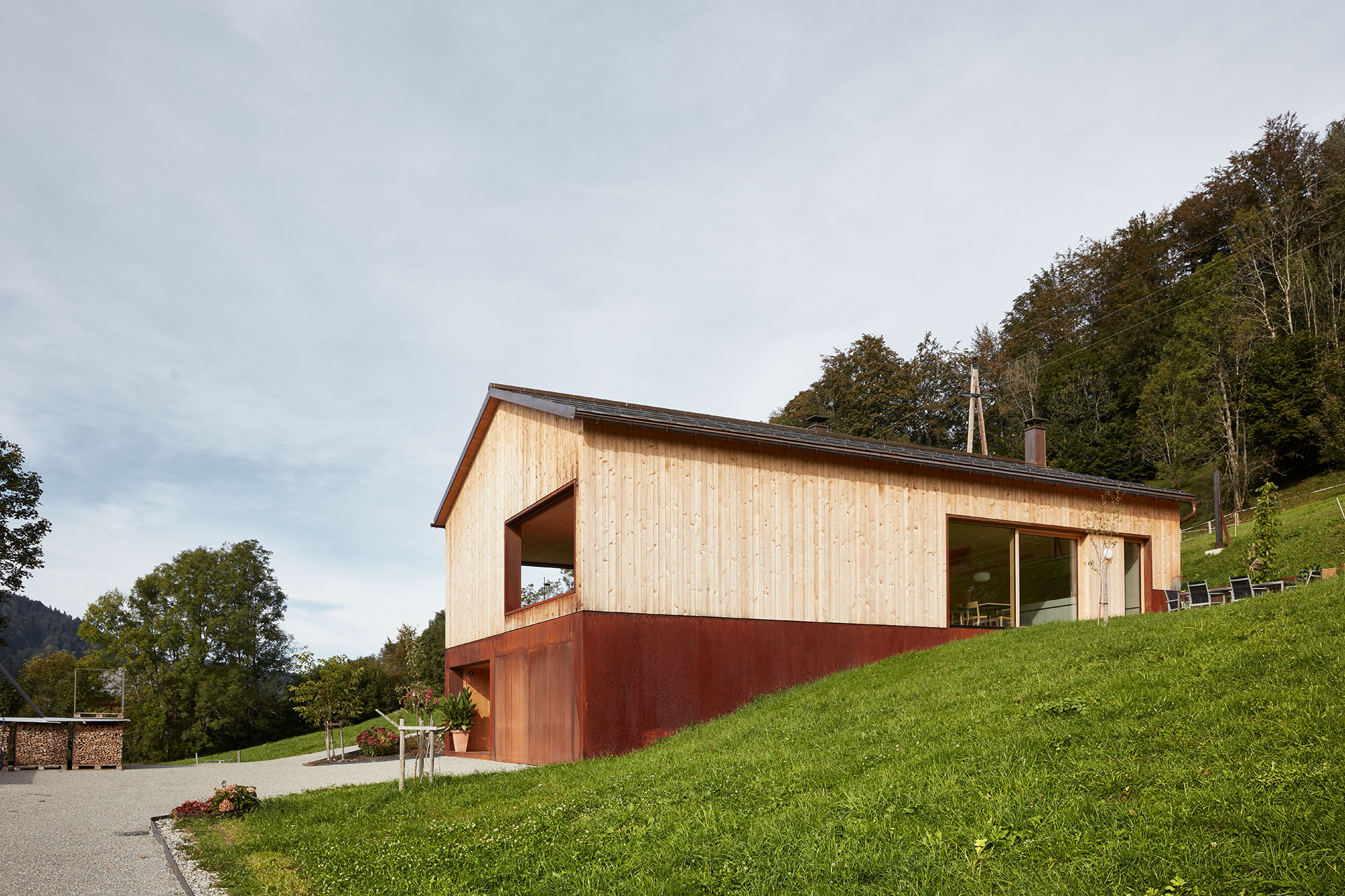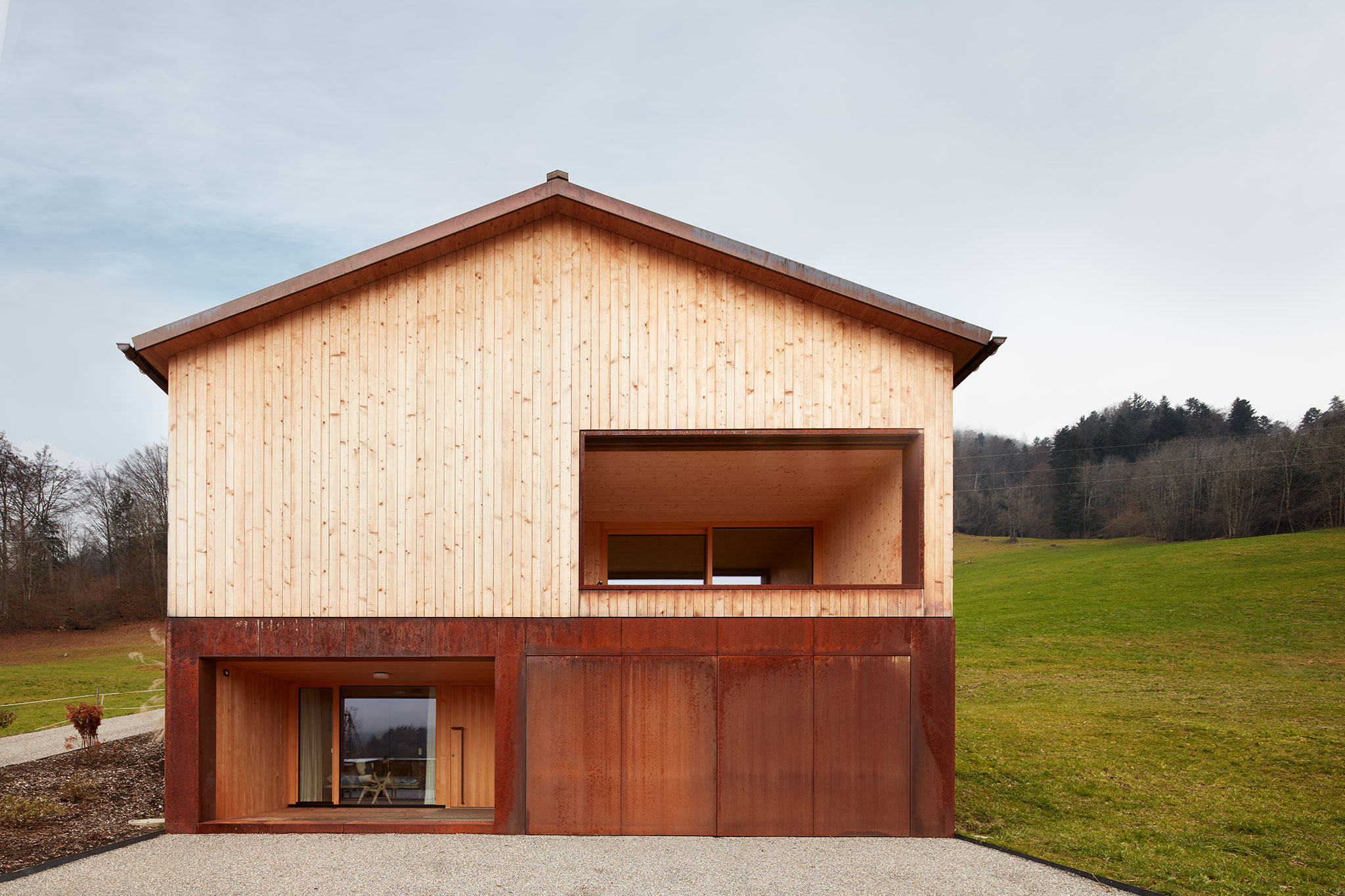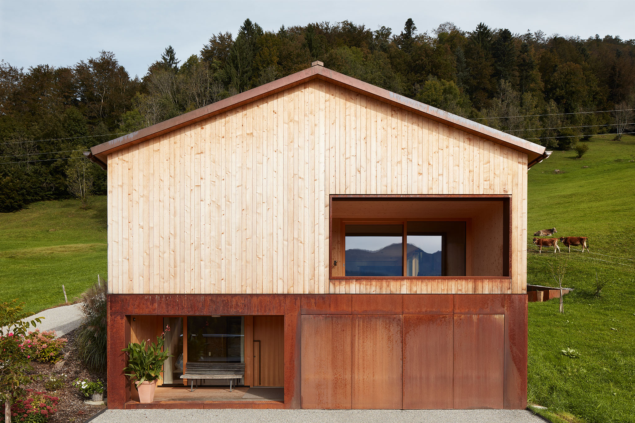 Der Gebäudesockel und die Fensterlaibungen sind mit Corten-Stahlblech verkleidet. Das Dach ist in Kupfer eingedeckt.