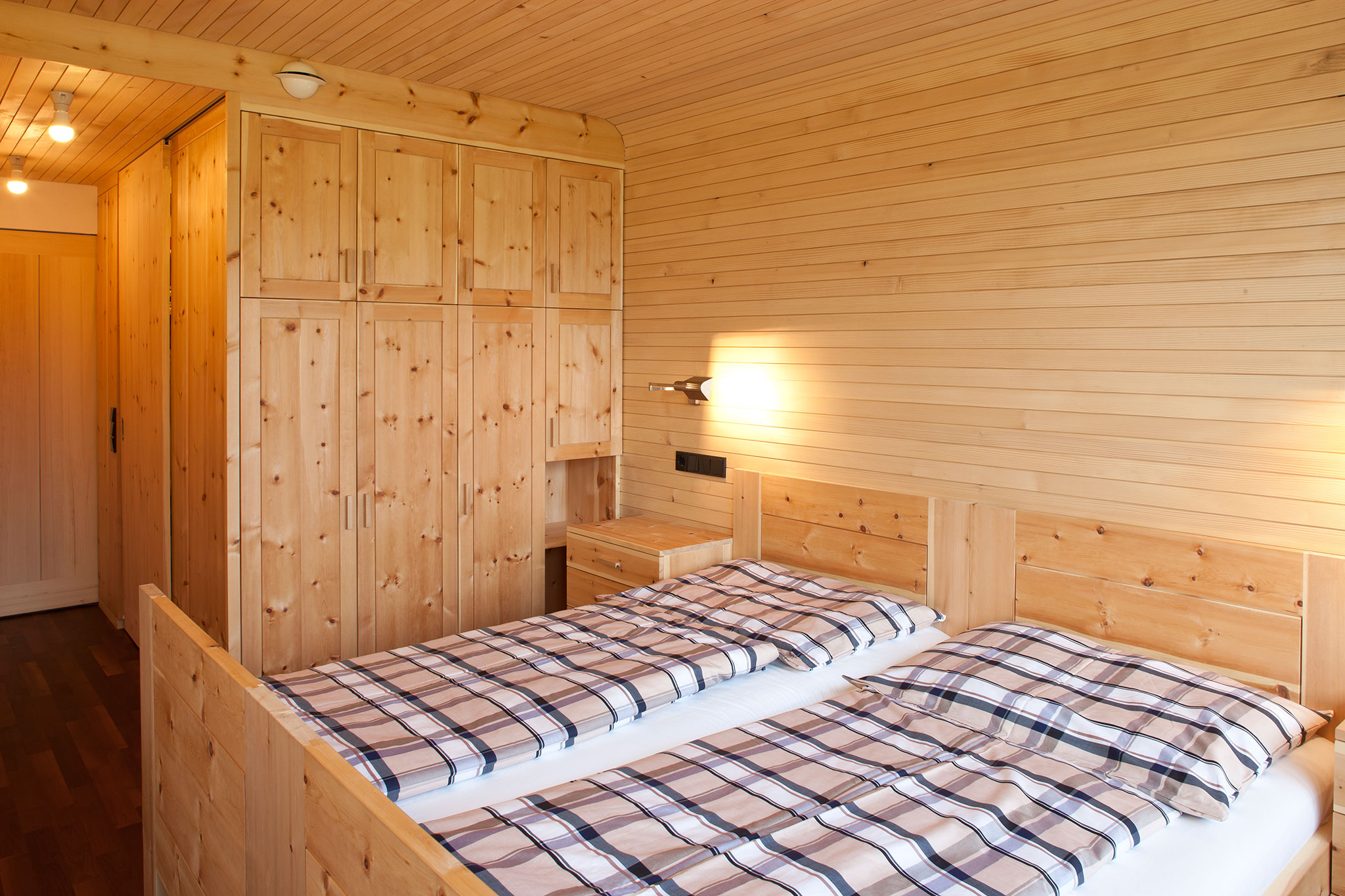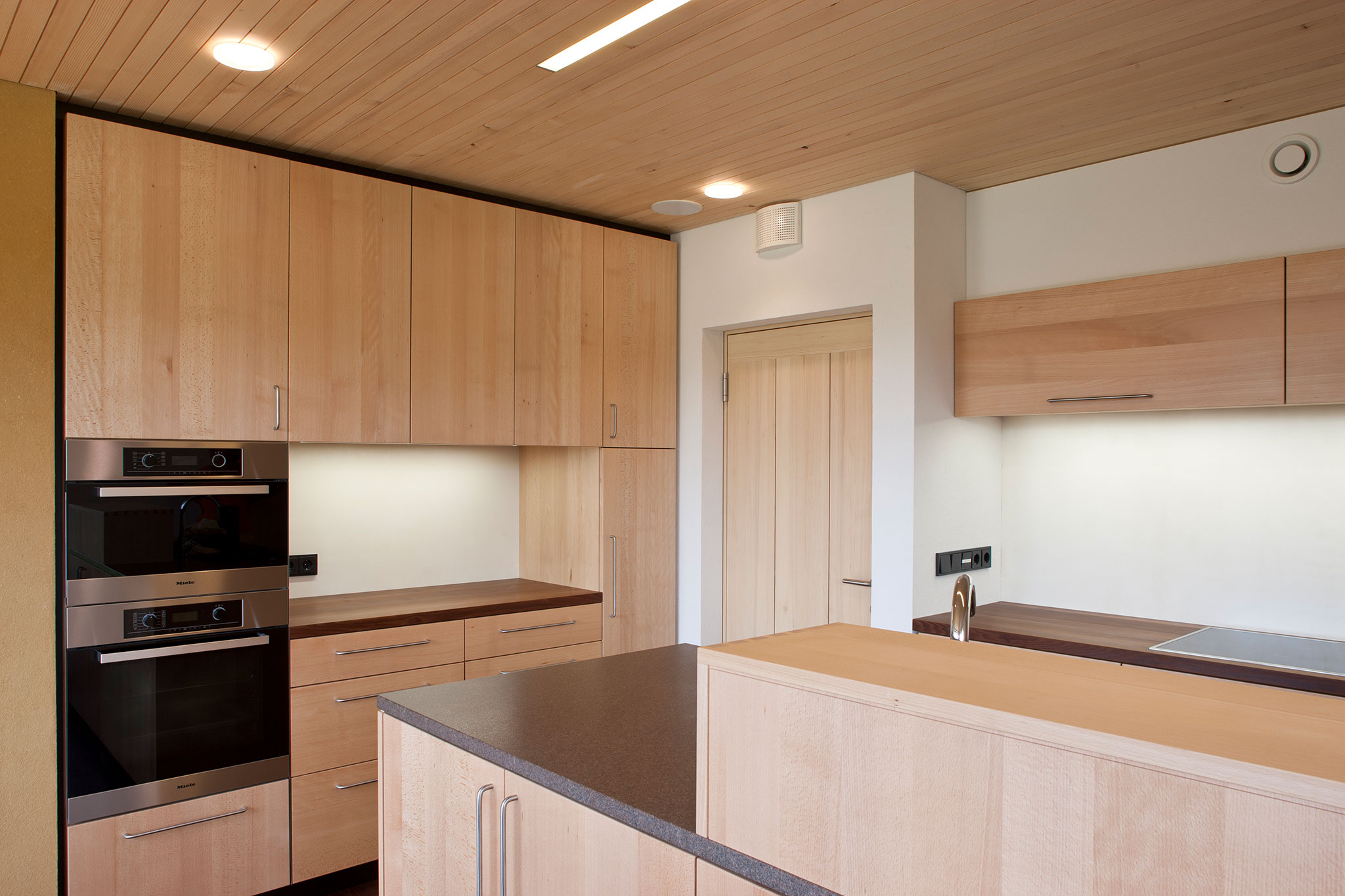 Die Zimmerei Häusler hat die gesamten Zimmermannsarbeiten mit vorgefertigten Elementen sowie den Innenausbau, der gesamten Deckentäfelungen sowie den Großteil der Wandverkleidungen im Obergeschoss, in astreiner Weisstanne ausgeführt. Mit viel Verständnis und Sorgfalt zu den, meist nicht dem alltäglichen Standard entsprechenden Detail wurden diese Arbeiten zur vollsten Zufriedenheit des Bauherrn und auch Architekten ausgeführt. Die ebenfalls ausgeführte Innentreppe kann man in ihrem fertigen Zustand sogar als kleines „Schmuckstück“ bezeichnen.